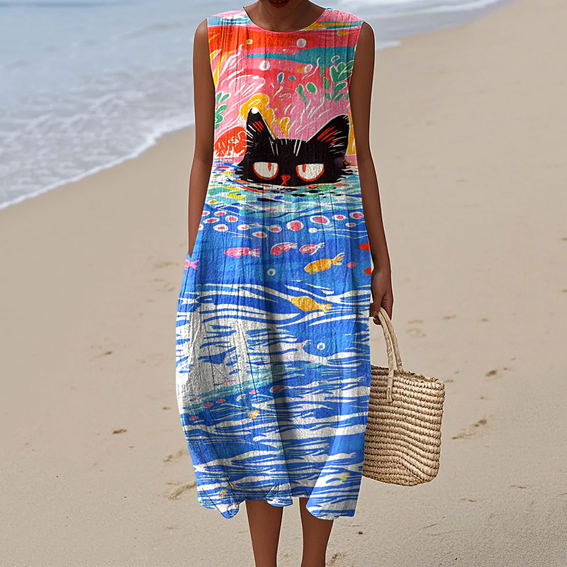 Abstract Creative Oil Cat Painting Art Linen Tank Dress