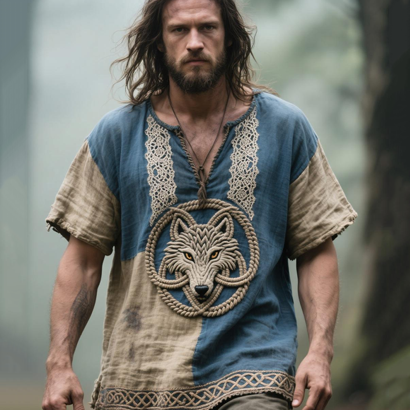 Men's Viking Celtic Wolf Embroidered Contrast V-neck Linen Blend Shirt