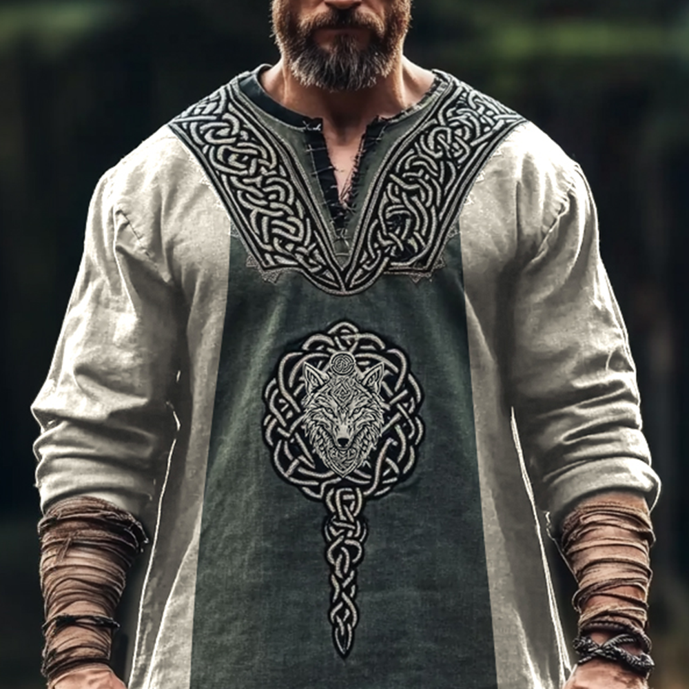 Men's Viking Wolf Celtic Knot Art Linen Long Sleeve T-shirt